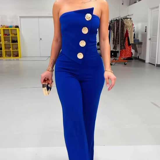 A sophisticated and refined jumpsuit featuring an elegant tube top and exquisite gold button details. Perfect for elevating your style and making a bold statement.