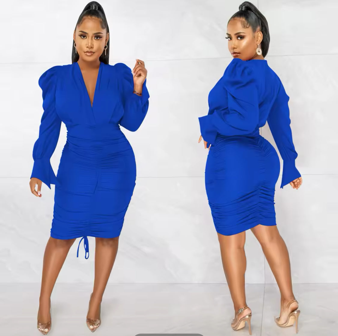 This midi dress features a v-neck, ruched body-con design, and long sleeves, making it perfect for formal parties.